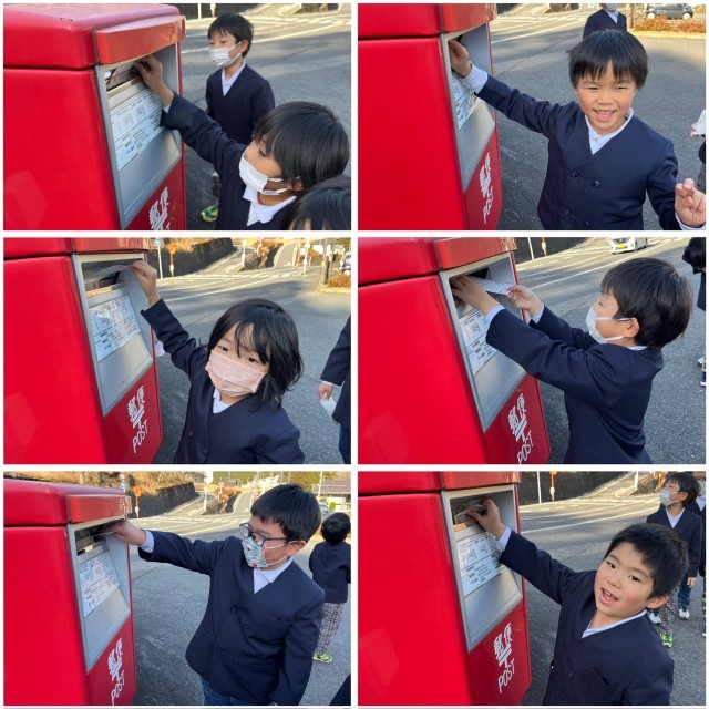 国語科の学習で書いた年賀状をポストへ投函しました。大切な人へ、想いが届きますように!