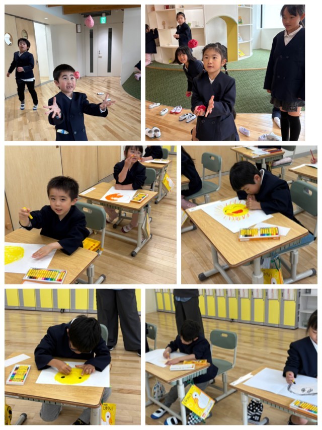 図工の時間には「お日様にこにこ」という題材で、自分の思い思いのお日様を描きました。また1年生を迎える会に向けて、自分の顔と好きな食べ物の絵も描きました。
