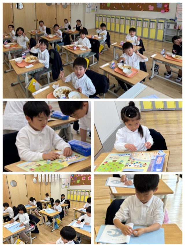 小学校初めての給食はカレーでした。重い食缶を運ぶのは大変そうでしたが、自分たちで上手に配膳作業ができました。
