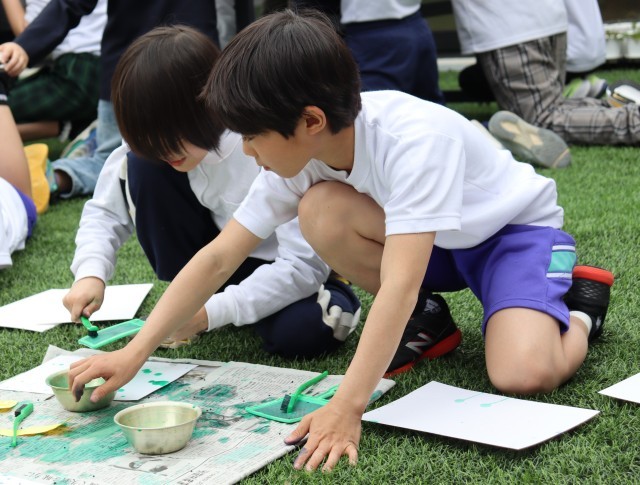 高学年の図工では、スクラッチやスパッタリングの技法を使い、色と形の不思議を追求しています。削って現れる鮮やかな色や、霧のように重なる色の粒に、子どもたちは夢中!偶然から生まれる美しさを生かした、個性あふれる作品が次々と誕生しています。