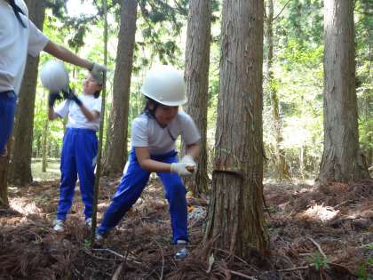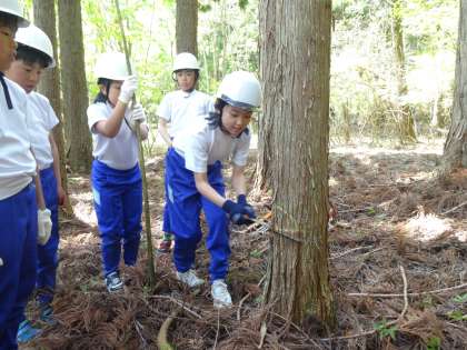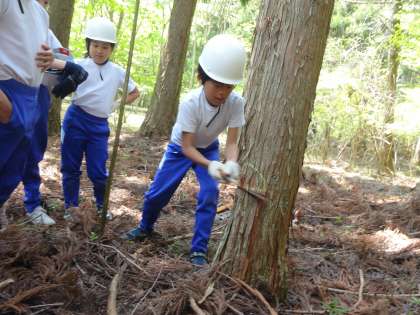 お昼からは、間伐体験をしました。初めての間伐体験ということで、みんな楽しくのこぎりを使っていました。友だちがのこぎりを使っている時に、「よく切れる。」や「がんばれ。」などの声が自然と出ていました。