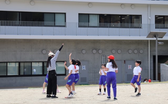 青空が広がる心地よい天気の日、校庭には子どもたちの元気な声が響き渡っています。本校の休み時間の自慢は、子どもたちだけでなく、教師も一緒になって本気で遊ぶことです。