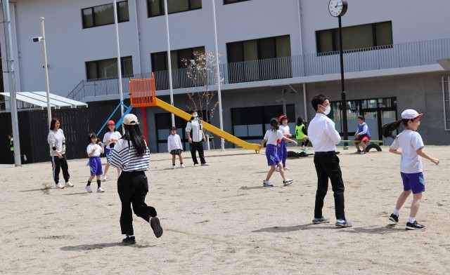 広々とした校庭で、滑り台などの遊具で遊んだり、追いかけっこをしたりと、思い思いに過ごすひととき。