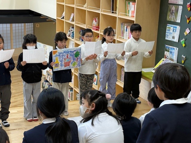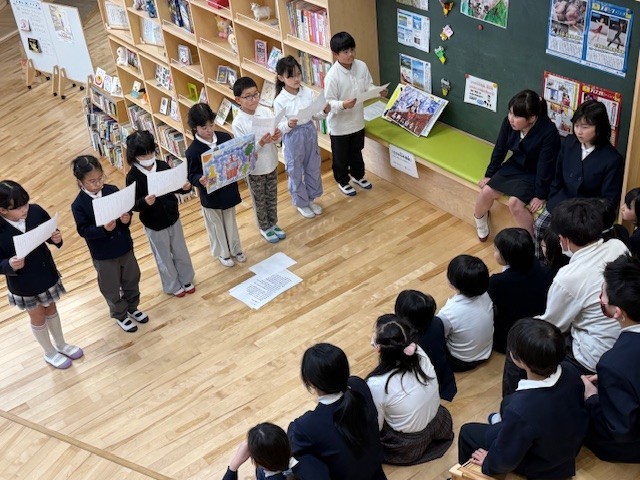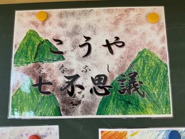 2年生の子供たちが、自分たちの住む高野町に古くから伝わる「高野七不思議」について学習し、その成果をオリジナルの紙芝居にまとめました。子供たちは、不思議な伝説の内容が他の学年の友達にもよく伝わるよう、一枚一枚丁寧に絵を描き、読み上げるための原稿も自分たちで準備しました。例えば、「高野にハブなし」というお話の場面では、大きなヘビの姿を色鮮やかで迫力たっぷりに描き出しています。完成した紙芝居は、他学年の児童を招いて発表されました。図書スペースに集まった児童たちの前で、2年生は手作りの原稿を手に、緊張しながらも一生懸命に声を出し、高野の不思議な物語を披露しました。見に来てくれた他学年の子供たちも、2年生が描いた絵と上手な語りに引き込まれるように、じっと聞き入っていました。地域の歴史や文化を学び、それを自分たちの言葉で伝えるという活動を通して、2年生の子供たちにとって大きな成長と自信につながる貴重な機会となりました。