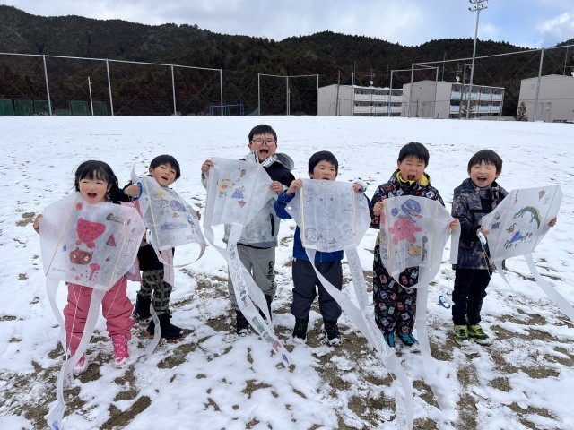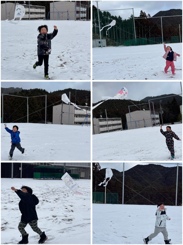 お正月といえば凧揚げ!少し遅れましたが、雪の積もった運動場で凧揚げをしました。風に乗った凧を見て、子どもたちは大はしゃぎ!休み時間の過ごした方がまた増えました!