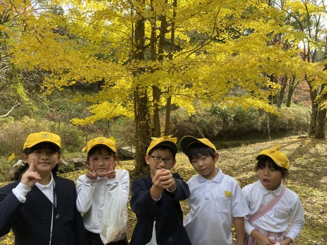 落ち葉拾いに行きました!きれいなイチョウやカエデ、桜の木の葉っぱなど、沢山拾うことができました。キャンプ場の近くでは沢山のどんぐりを拾いました。この落ち葉は、伊都地方総合文化祭に出品する生活科の作品で使用する予定です。(お休みだった子の分も沢山拾ったので安心してね。)