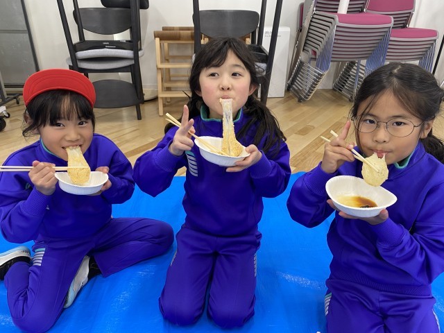 今日はもちつき大会でした!もち米をお餅のようにモチモチにするために、沢山お餅をつくことが大変だと学びました。頑張ってついたお餅はとってもおいしくて、沢山食べました!
