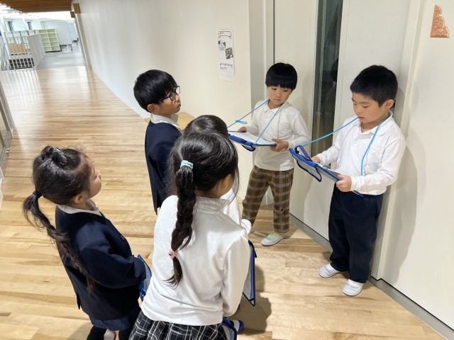 学校たんけんで1年生に校内を案内しました。学校にはどんな場所があるのかや、学校のきまりなどを教えることができました。