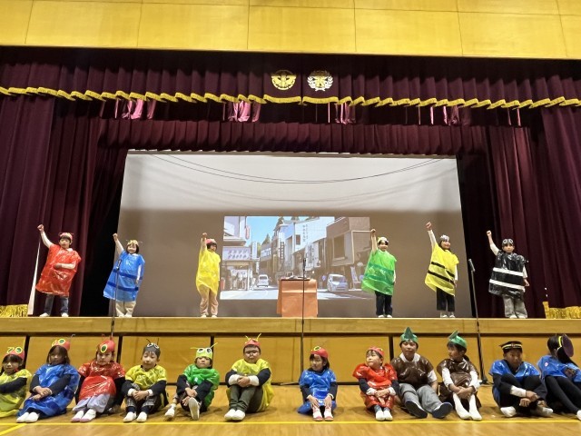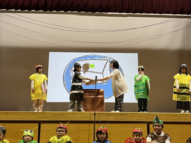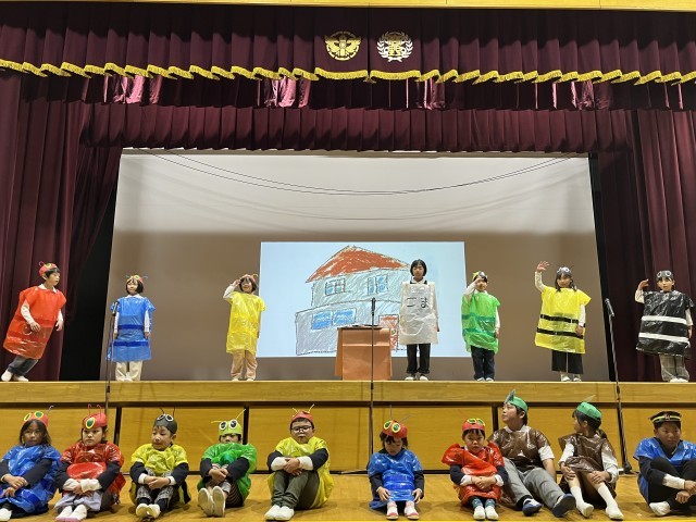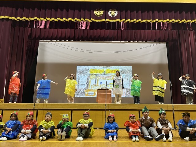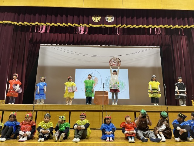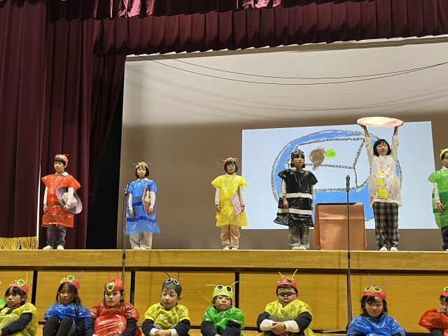 英語発表会で、はらぺこあおむしの劇をしました。難しい英語にも挑戦し、堂々と舞台に立つ姿はとてもかっこよったです。