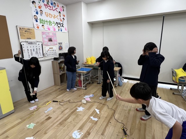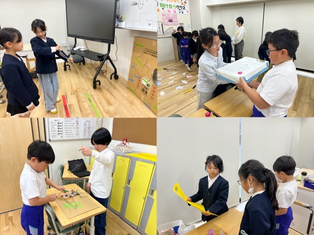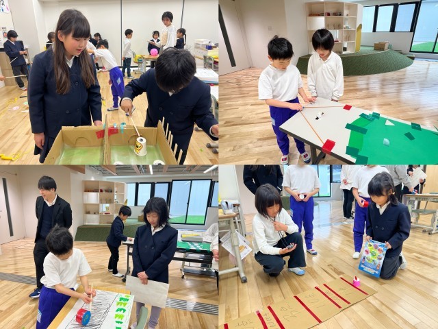理科で学んだことを使っておもちゃを作り、1、2年生を招待しておもちゃランドを開催しました。