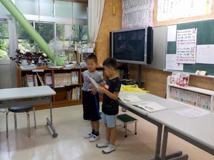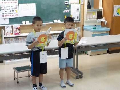 今日は、1年生が日直さんでした。1分間スピーチでは、2人で「おおきなかぶ」の朗読をしてくれました。