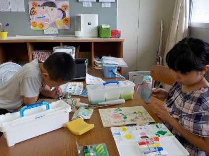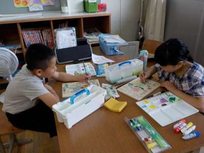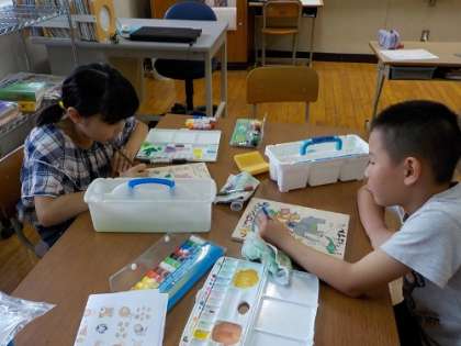 3,4年生は、図工の続きです。集中して細かいところの色塗りをしていました。