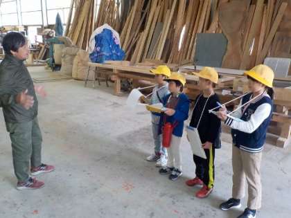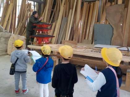 今日は、花坂の工房岡本さんにも行かせていただきインタビューをしました。以前に大阪で作った三重の塔の10分の1の精巧な模型を見せていただいたり、仕事で使用する道具について教えていただいたり、実際にカンナで木を削らせていただきました。児童は、体験をさせていただき喜んでいたそうです。インタビューのまとめを頑張って、いい発表になるといいですね。今日は、お忙しい中お時間を作っていただき、ありがとうございました。