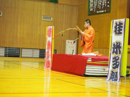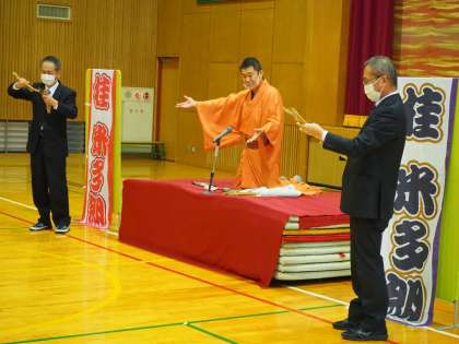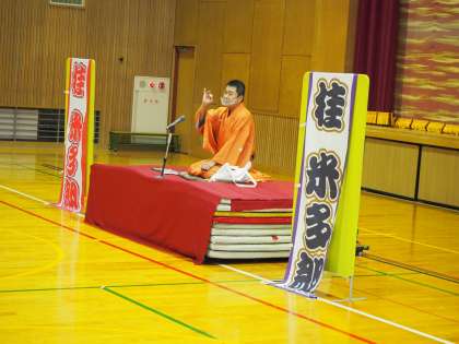 落語の前に「南京玉すだれ」の実演を見せてもらい、すぐに2校の校長先生が前に呼ばれ「南京玉すだれ」にチャレンジすることになりました。戀中校長先生は上手くやれていましたが、私は全然上手くできず残念でした。やってみて、すごく難しいのがわかりました。