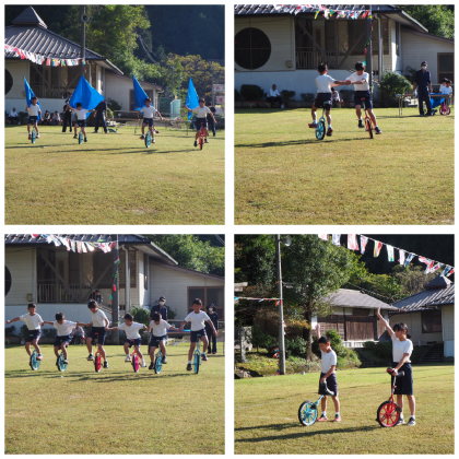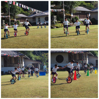 児童による「花小一輪車隊」の演技では、運動場の芝生が濡れて滑りやすくなっていて、いつも通りの演技をするのが難しかったのですが、失敗しても最後まで演技に集中してやりきりました。
