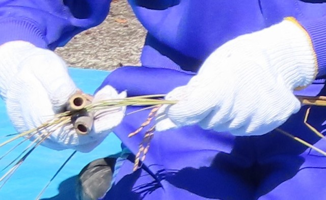 今回初めて、子どもたちは、「扱き箸」の使い方を教えてもらい、稲を二本の棒の間にはさみ、引き抜いて「もみ」と「わら」に分けていました。