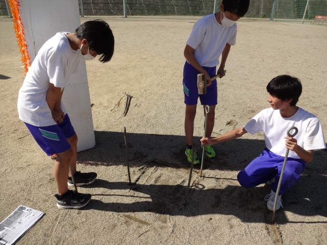 本日はその体育祭の準備を行いました。杭を打ってロープを張ったり、テントを立ててイスを並べたり、生徒教職員一丸となって用意しました。