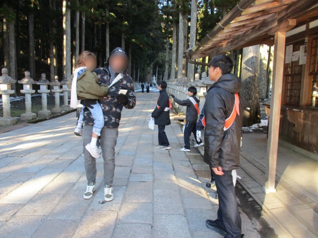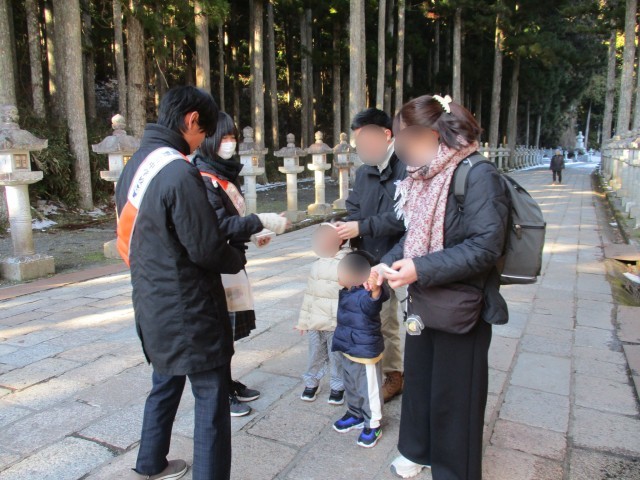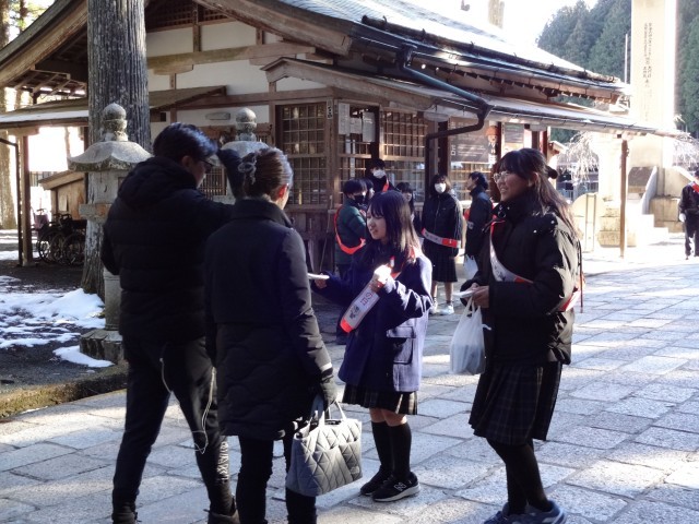 寒い中でしたが、生徒たちは、日本語はもちろん英語を駆使して啓発文が書かれたティッシュを奥之院への参拝客のみなさまに配っていました。
