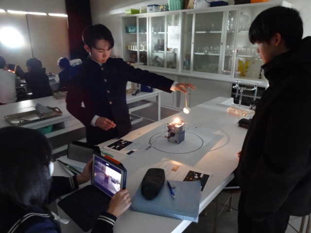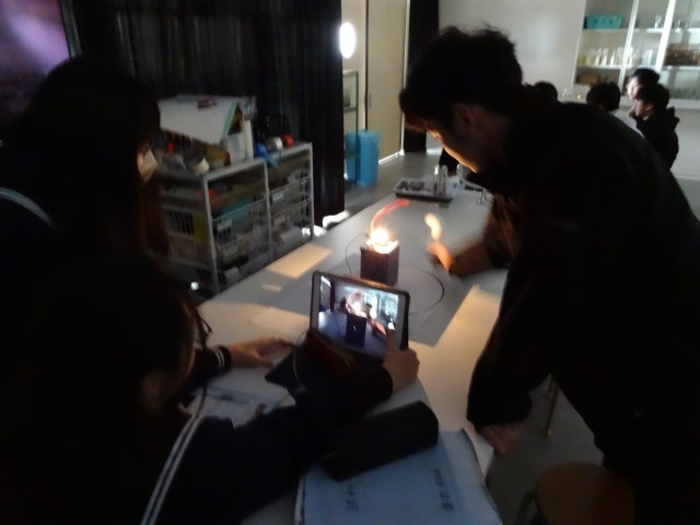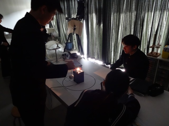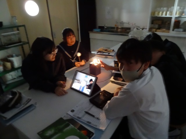 太陽を電球、金星を発泡スチロールの球、地球の観察者をタブレットとそれぞれ置き換え、金星の位置が変わることで、地球からの見え方がどのように変わるかを調べました。