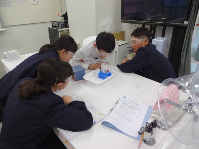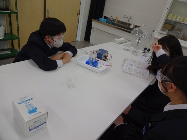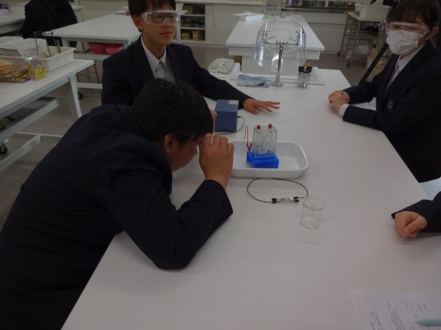 電極から気体が発生しているようすを興味深そうに見つめていました。