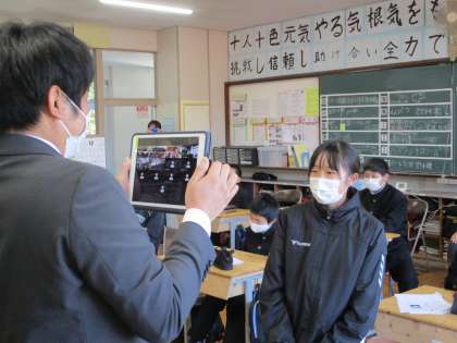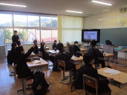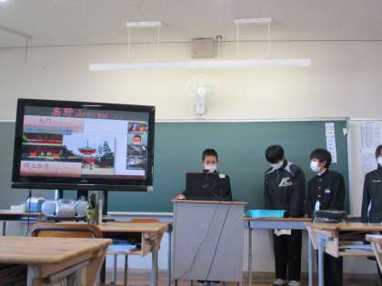 弘法大師の縁でつながっている善通寺市の中学生と交流を行いました。善通寺市立東中学校・西中学校の選抜された十数名と本校1年生が,各地の名所や有名なお菓子について発表し合いました。善通寺市の発表はクイズを交えての発表でとても楽しかったです。本校の生徒も一生懸命総合的な学習の時間で得たことを発表していました。最後はお互いの名産品を試食して,次回は行ったり,来てもらったりたいねなどと語り合いました。