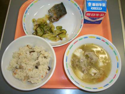 松茸ごはん・牛乳・鰆のゆず醤油焼き・キャベツの塩昆布あえ・豚汁