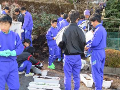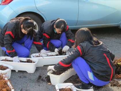 今日、午前中に中間テスト2時間、授業2時間のあと、午後に、枯れてしまったベゴニアを植えてあった約300個のプランターの片付けをしました。作業は、 1枯れたベゴニアの茎と根を抜き取り、土を落とす。 2プランターの土を所定の場所に持っていく。 3プランターを水洗いする。 4プランターの設置してあったところをほうきではき、きれいにする。 5プランターを倉庫に片付ける。5つの作業を分担して行いました。また、今日の午後までに、ボランティア部や1・2年の技術の時間にも作業をしてくれてあったので、助かりました。放課後は残りの作業をボランティア部と環境整備部の生徒の皆さんが行ってくれました。みんなよく頑張ってくれました。お疲れさまでした。
